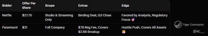$Netflix(NFLX)$ Buckle up, entertainment fans โ the showdown for Warner Bros. Discovery is turning into a blockbuster thriller! ๐ Paramount just cranked up the heat with a juicy $31 per share all-cash offer for the whole empire, tossing in a massive $7 billion regulatory safety net and even covering that pesky $2.8 billion breakup tab Warner owes Netflix if things go south. But hold your popcorn ๐ฟ โ Netflix's ironclad $27.75 per share deal for the studio and streaming jewels stays locked in, set to seal by Q3. Experts are buzzing that Netflix holds the edge, ready to swoop in and match or topple that rival bid like a boss. ๐ฅ