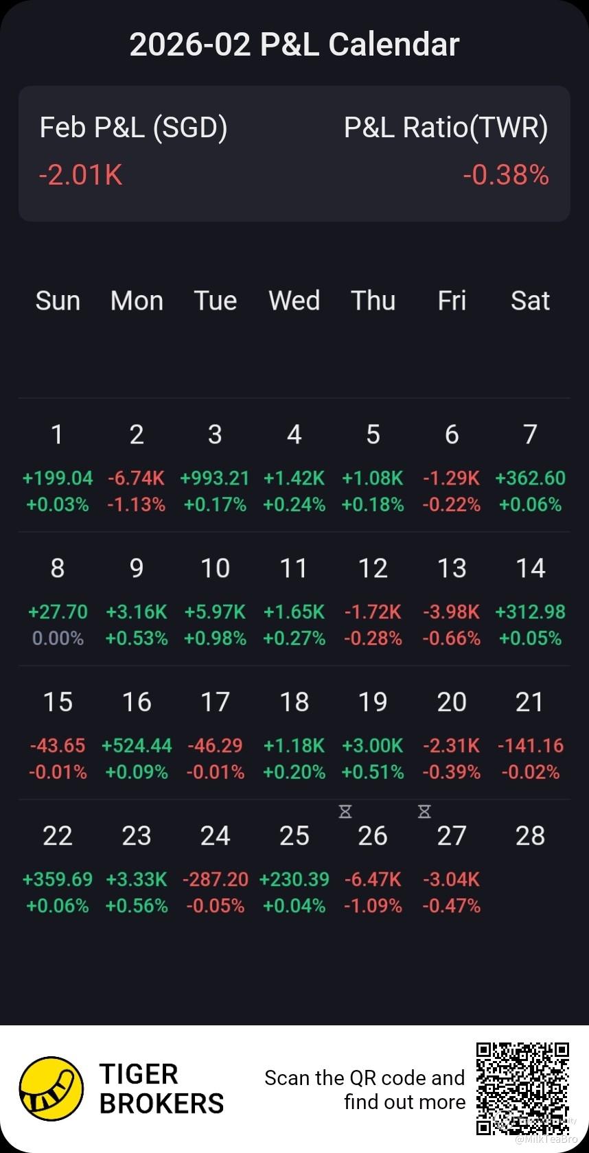 Feb 2026 Portfolio Performance: A loss of SGD 2000, representing a 0.4% loss.