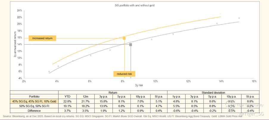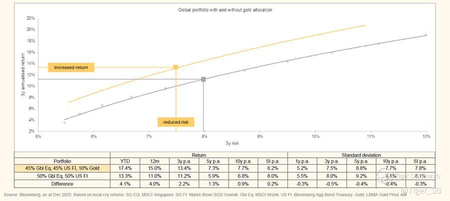 3) Portfolio with gold allocation exhibits less risk and higher return