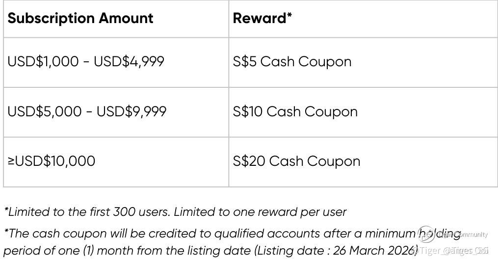 ^The cash coupon will be credited to qualified accounts after a minimum holding period of one (1) month from the listing date (Listing date : 26 March 2026)