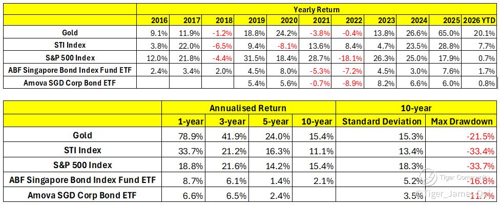 Table: Gold vs STI vs S&P 500 Index vs Bond ETFs Performance