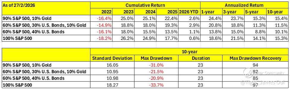 Adding a small allocation to gold may improve portfolio diversification while lowering volatility and reducing drawdowns.