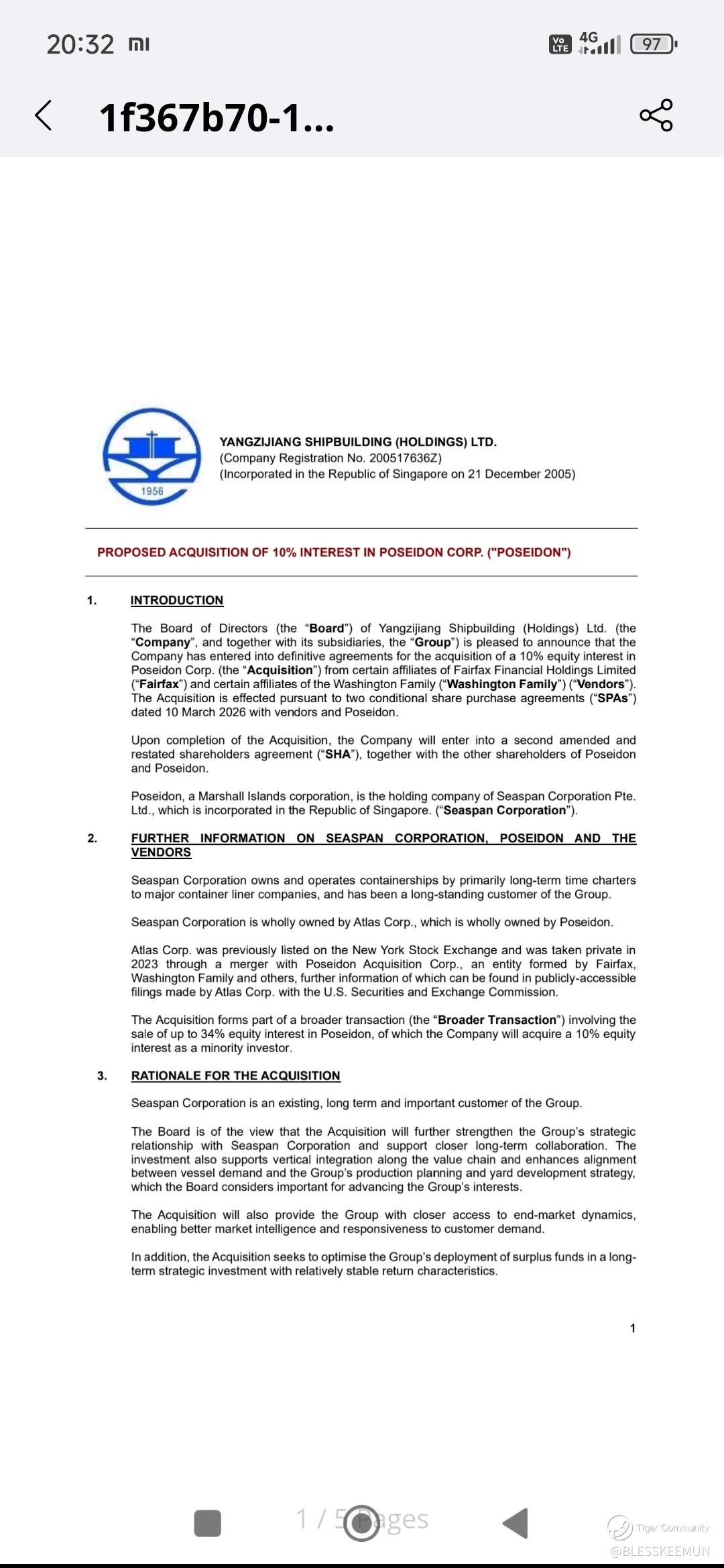YZJ- 10% SHARE ACQUISITION ON SEASPAN