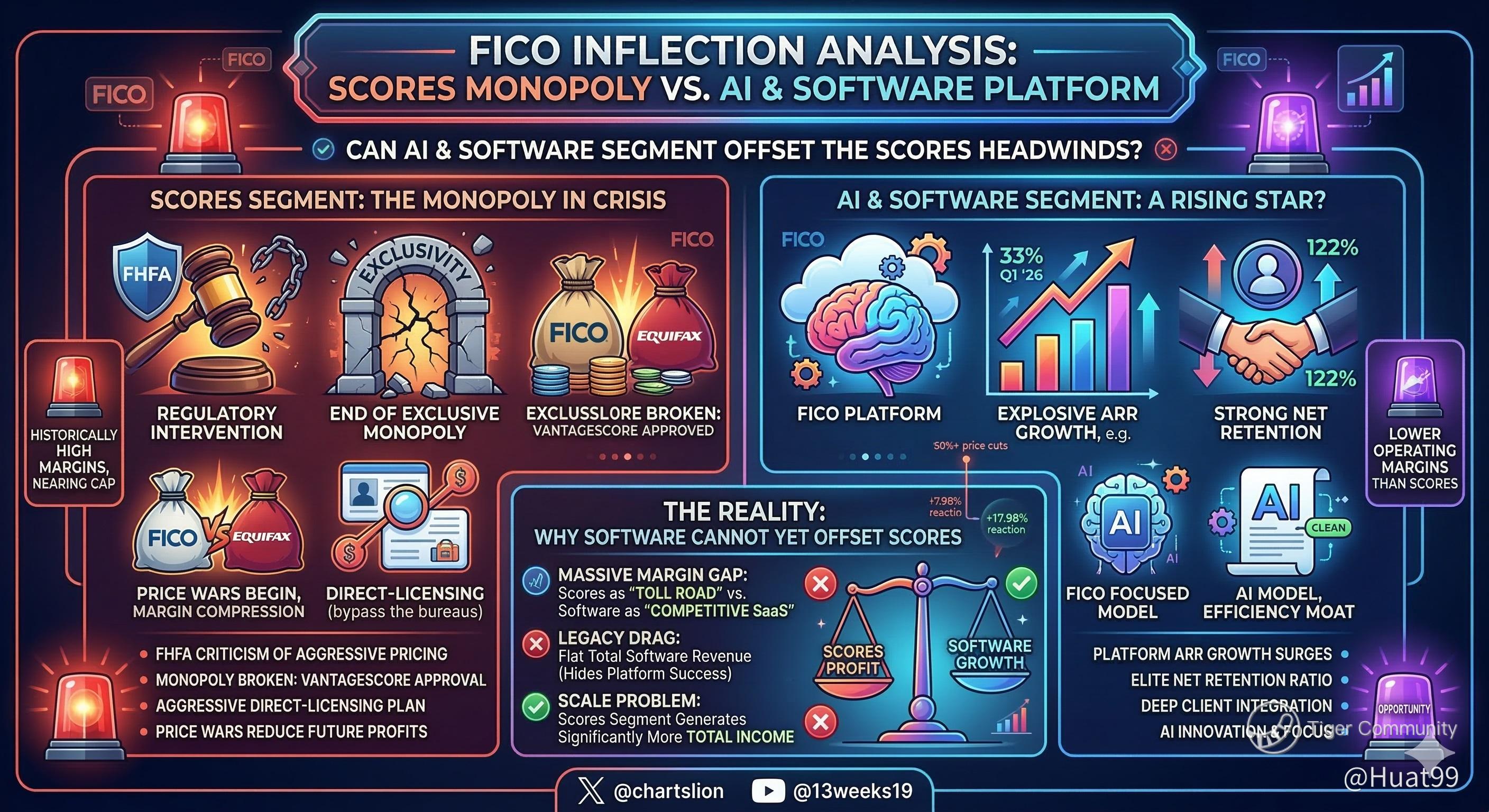 For decades, FICO’s "Scores" segment operated like a high-margin toll road. But with recent FHFA regulatory scrutiny, VantageScore breaking their government-backed exclusivity, and a fierce price war with Equifax, that monopoly is officially under fire.
