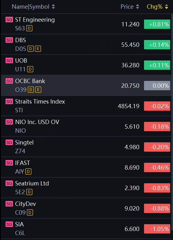 Singapore stocks opened flat on Friday. ST Engineering up 0.8%; DBS, UOB up slightly; Singtel, iFast, Seatrium down within 1%.