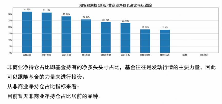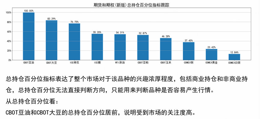 In agriculture, CBOT corn is at -16.53%, soybean oil at -17.40%, and soybeans at -22.53%. This shows that agricultural producers are fairly willing to hedge, especially in soybeans and soybean oil, which may suggest that farmers are reasonably satisfied with current prices and are actively locking in profits.
