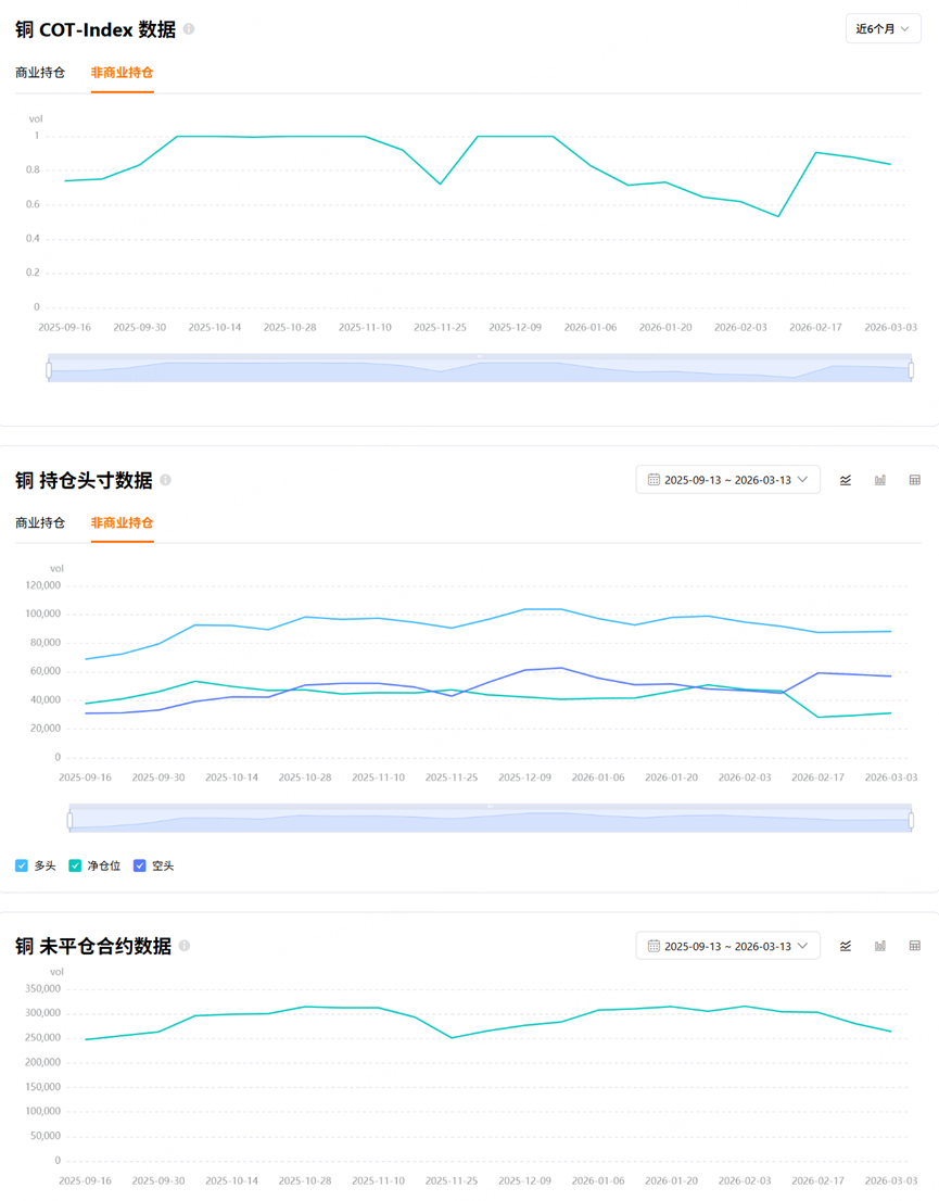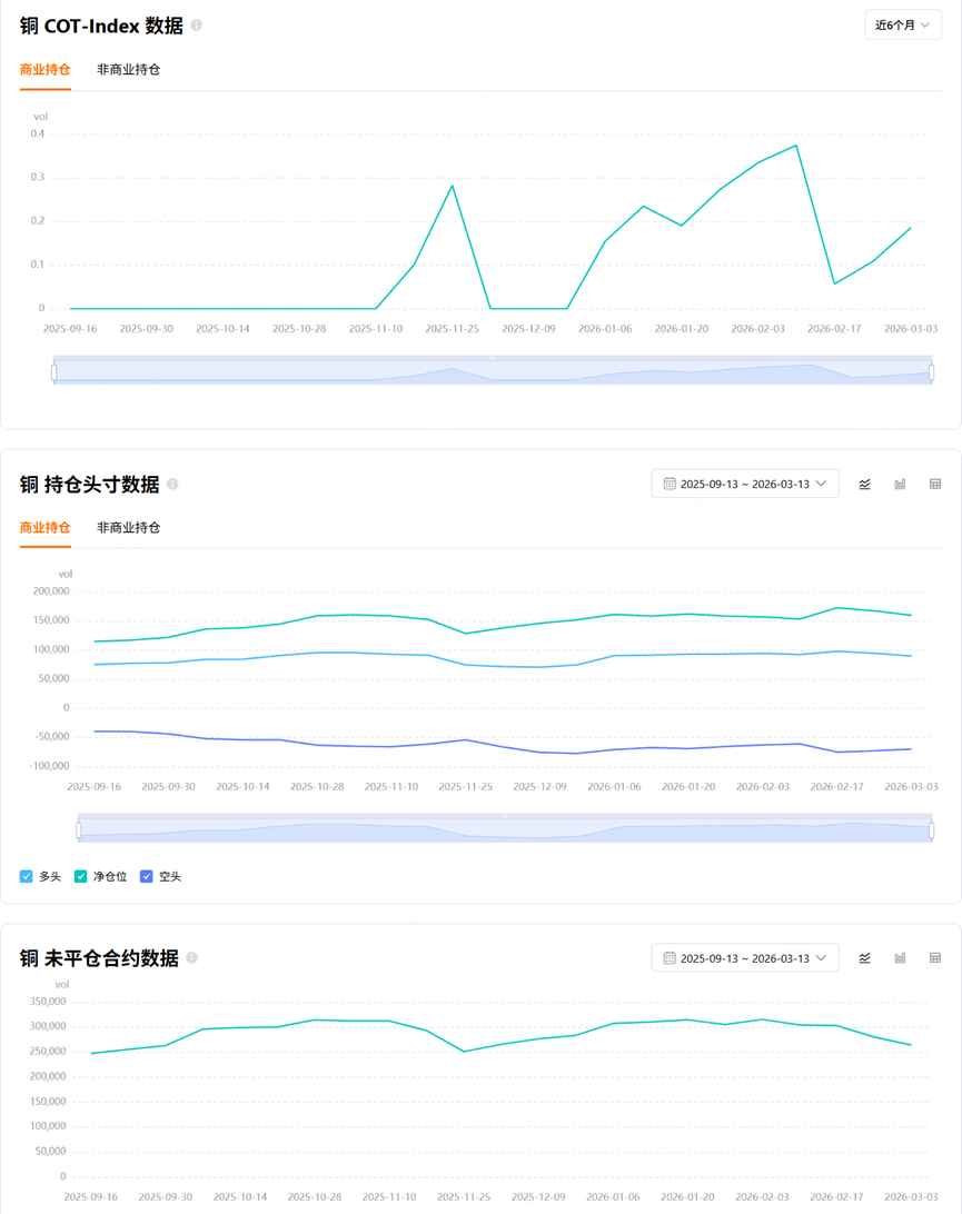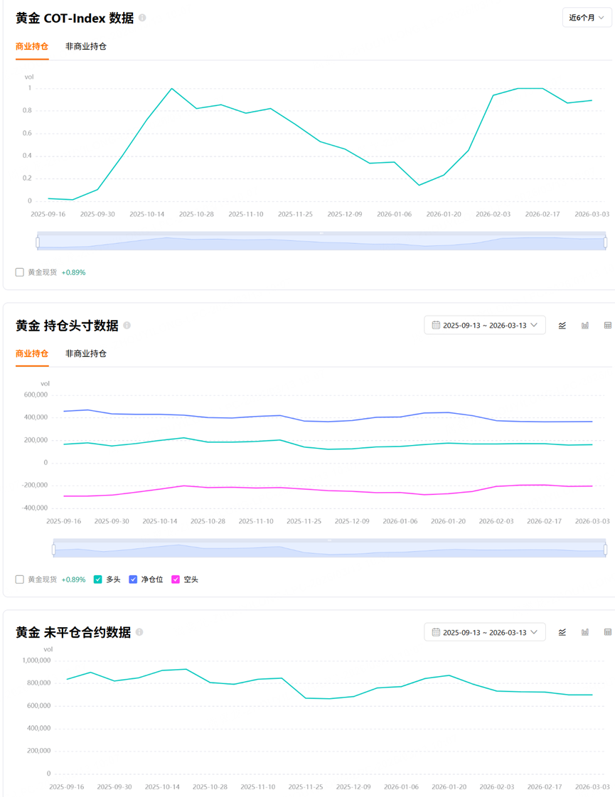 The commercial net position ratio reflects the proportion of net long positions held by producers and merchants. Under normal circumstances, this figure is negative, because producers usually hedge spot exposure by shorting futures, so their short positions tend to exceed their longs. When this number turns positive, it means producers are net buyers, which often signals that prices may be bottoming, because the people who understand the industry best are starting to turn bullish.