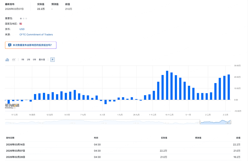 The latest CFTC release came out on Saturday, March 7, Beijing time. But because institutions need time to compile the data, the report only reflects positions through Tuesday. In other words, the detailed statistics we are looking at today are actually from last Tuesday and earlier. The data may be a bit old, but if we analyze it together with price action, it can still help us form a broad view of where the market may be headed, instead of constantly trading on short-term speculation and emotion.