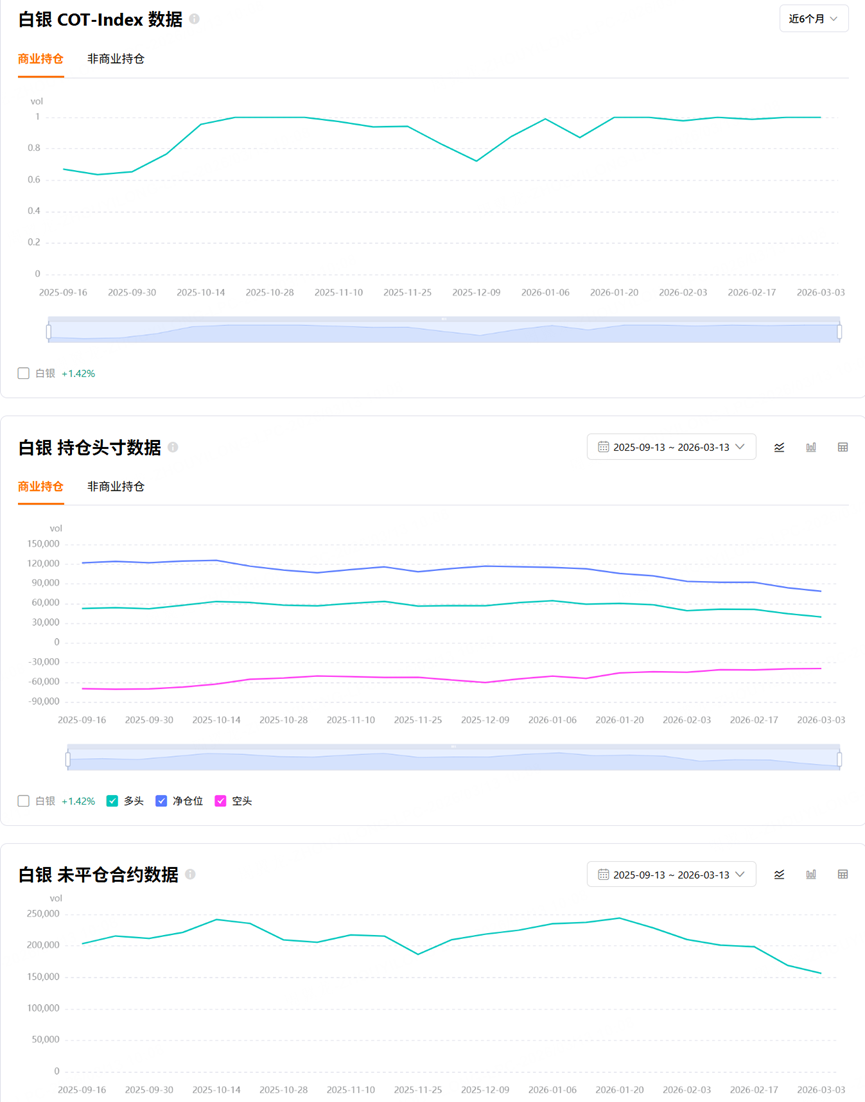 All the other products are in negative territory, which means producers are still net short overall for hedging purposes. The most notable precious metals contracts are COMEX gold at -3.72% and COMEX silver at -9.69%. Both are negative, but the magnitude is not extreme, which suggests that precious metals producers are under some hedging pressure, though not yet at historical extremes. $黄金主连 2604(GCmain)$ $铂金主连 2604(PLmain)$ $白银主连 2605(SImain)$ $迷你白银主连 2605(QImain)$ $白银2603(SI2603)$ $2倍做多白银ETF-ProShares(AGQ)$