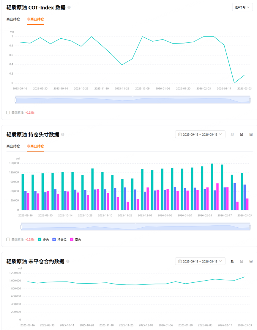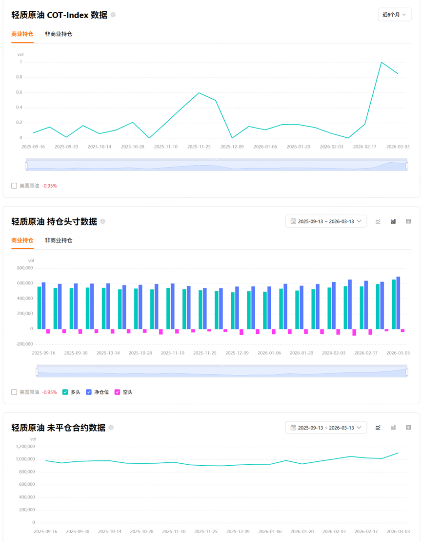 From the chart, we can see that WTI crude oil has a commercial net position ratio of +6.66%, and not only has it stayed positive, it has also been rising recently. That is highly unusual relative to other contracts. In practice, however, this indicator tends to remain positive for WTI over long periods, so its signal value is limited. It should not be read as a simple bullish sign without looking at other factors as well. $小原油主连 2604(QMmain)$
