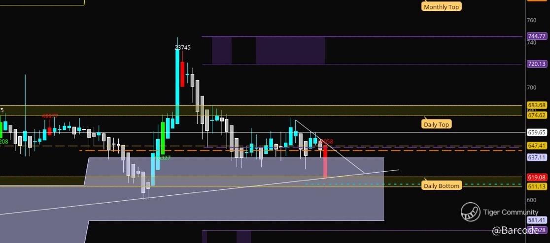 This area now defines the immediate battleground between buyers defending structure and sellers pressing for continuation. A sustained break below this band would expose a deeper liquidity pocket toward $600, with the next significant structural support sitting near $581. ๐ป