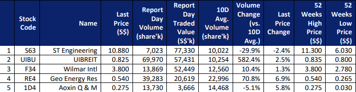 $ST Engineering(S63.SI)$ $UIBREIT(UIBU.SI)$ $Wilmar Intl(F34.SI)$ $Geo Energy Res(RE4.SI)$ $Aoxin Q & M(1D4.SI)$