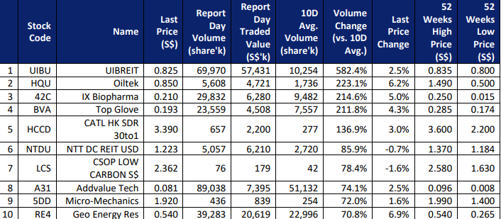 $UIBREIT(UIBU.SI)$ $Oiltek(HQU.SI)$ $IX Biopharma(42C.SI)$ $Top Glove(BVA.SI)$ $CATL HK SDR 30to1(HCCD.SI)$ $NTT DC REIT USD(NTDU.SI)$ $CSOP LOW CARBON S$(LCS.SI)$ $Addvalue Tech(A31.SI)$ $Micro-Mechanics(5DD.SI)$ $Geo Energy Res(RE4.SI)$