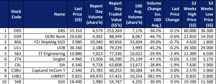 $DBS(D05.SI)$ $OCBC Bank(O39.SI)$ $YZJ Shipbldg SGD(BS6.SI)$ $UOB(U11.SI)$ $ST Engineering(S63.SI)$ $Singtel(Z74.SI)$ $SIA(C6L.SI)$ $CapLand IntCom T(C38U.SI)$ $UIBREIT(UIBU.SI)$ $SGX(S68.SI)$