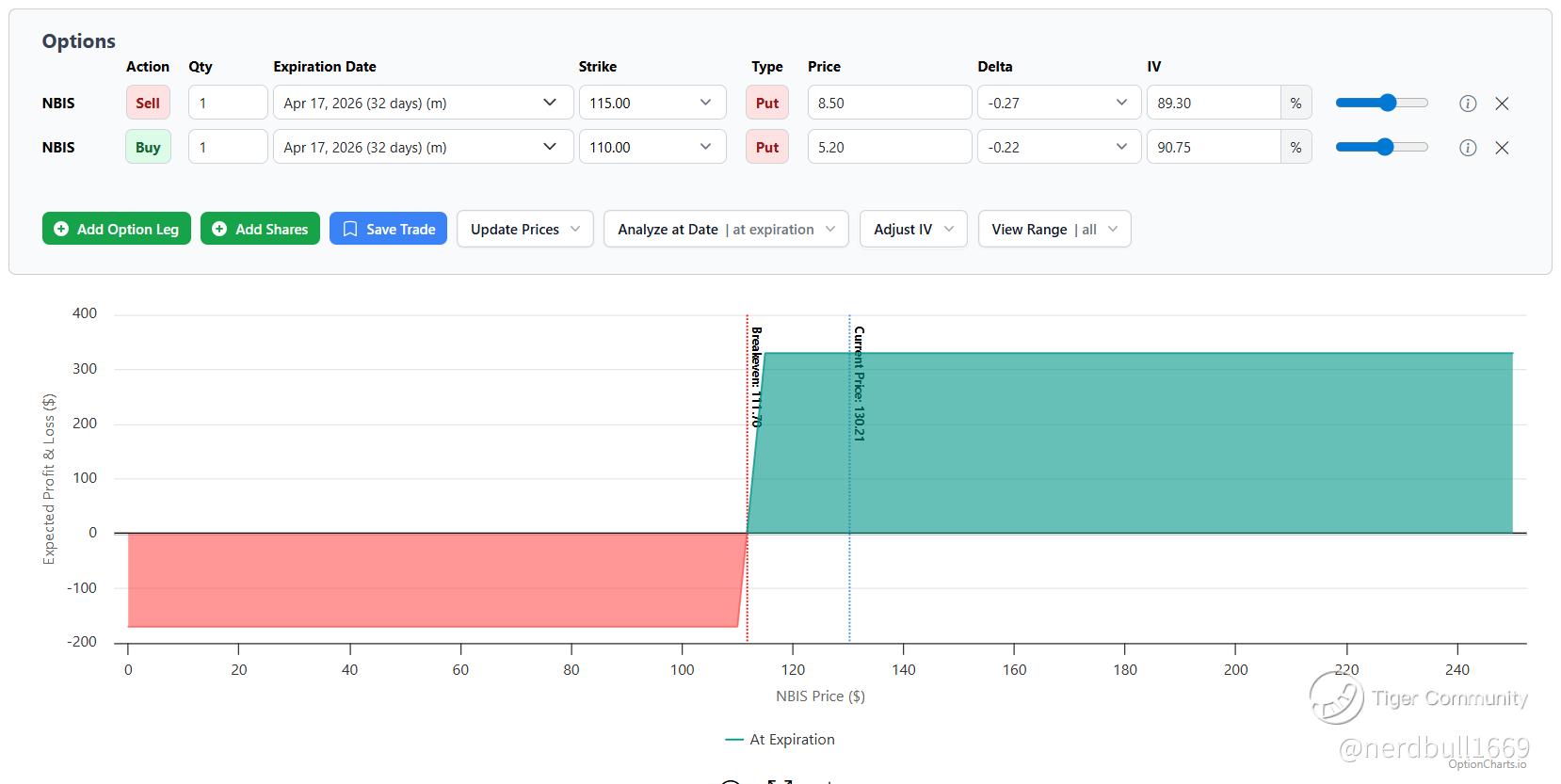 Objective: Generate income by betting that NBIS will stay above its key support level of $110 while its high Implied Volatility (currently ~91%) eventually "crushes" or cools down.