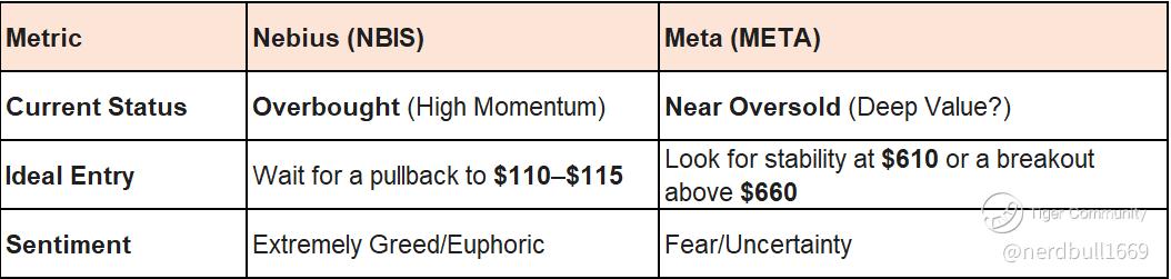 Summary: If you are looking to enter Nebius, the technicals suggest waiting for the "gap" created by the news to fill or for the RSI to drop back toward 50. For Meta, the indicators suggest it is currently "unloved," which often provides a better entry point for long-term investors, provided the 20% layoff plan successfully protects margins.