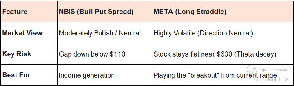 Note on Volatility: For Nebius, you are a seller of volatility (benefiting from IV crush). For Meta, you are a buyer of volatility (benefiting from a massive price swing).