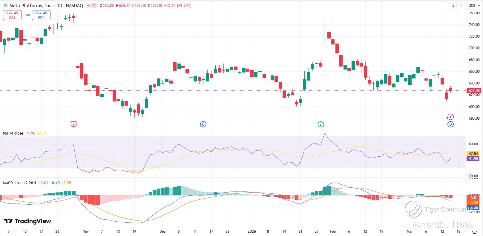 Moving Averages: META is currently trading below its 50-day SMA ($644) and 200-day SMA ($654). For bulls, a reclaim of the $655 level is critical to shift the long-term trend back to positive.