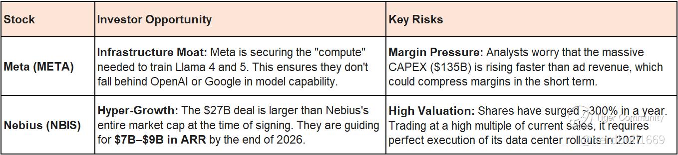 While Nebius is the immediate momentum play, its current "euphoric" price requires caution. Meta remains a high-conviction play for those betting that this infrastructure will eventually monetize through "Agentic AI" and improved ad margins.