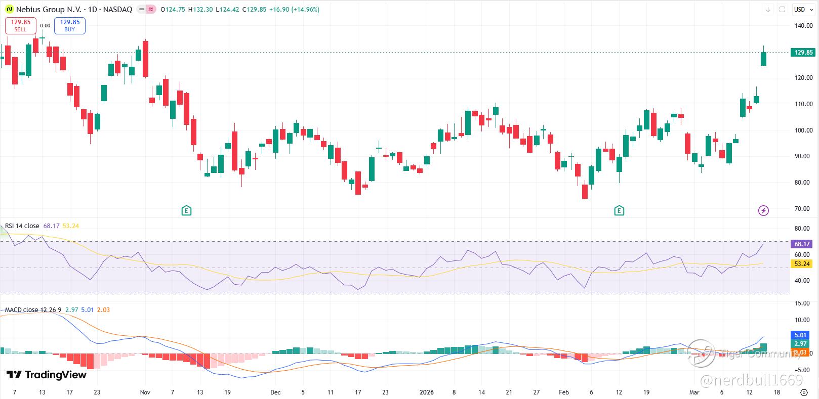 RSI (Relative Strength Index): Currently sitting near 72–75. This is officially in the "Overbought" territory (above 70). Historically, when NBIS hits these levels, it often precedes a "cooling off" period or a sideways consolidation.