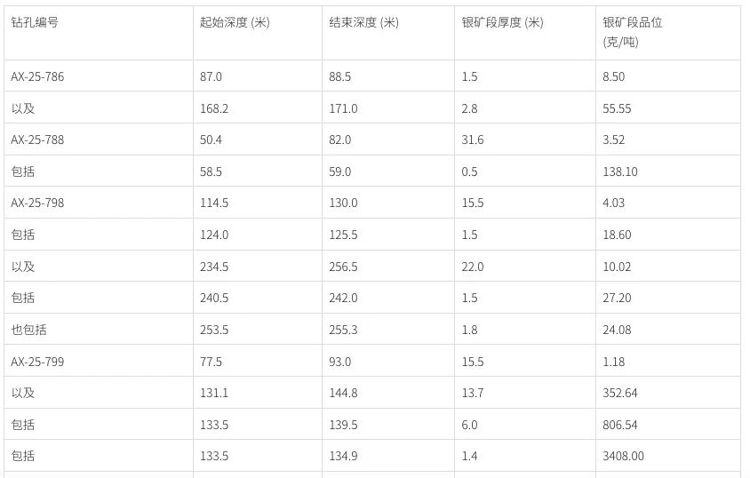 Drill Hole AX-25-810 – 1.5 meters of 880 g/t silver, within a 4.8-meter interval averaging 273.35 g/t silver; additionally, 1.0 meter of 248 g/t silver, within a 4.1-meter interval averaging 114.52 g/t silver.