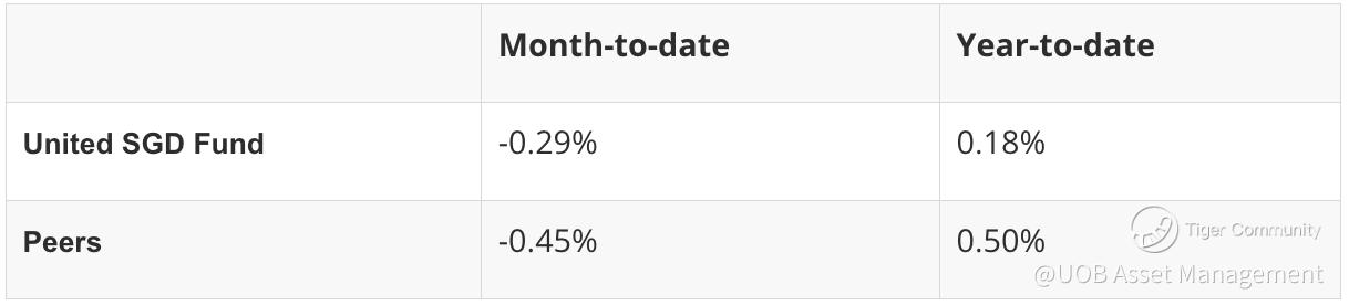 Amid the rise in US Treasury yields and wider credit spreads in recent weeks, the United SGD Fund (the “Fund”) has declined 0.29 percent in the month to date. Even so, it has held up better than its Morningstar peer group, which fell by an average of 0.45 percent over the same period.
