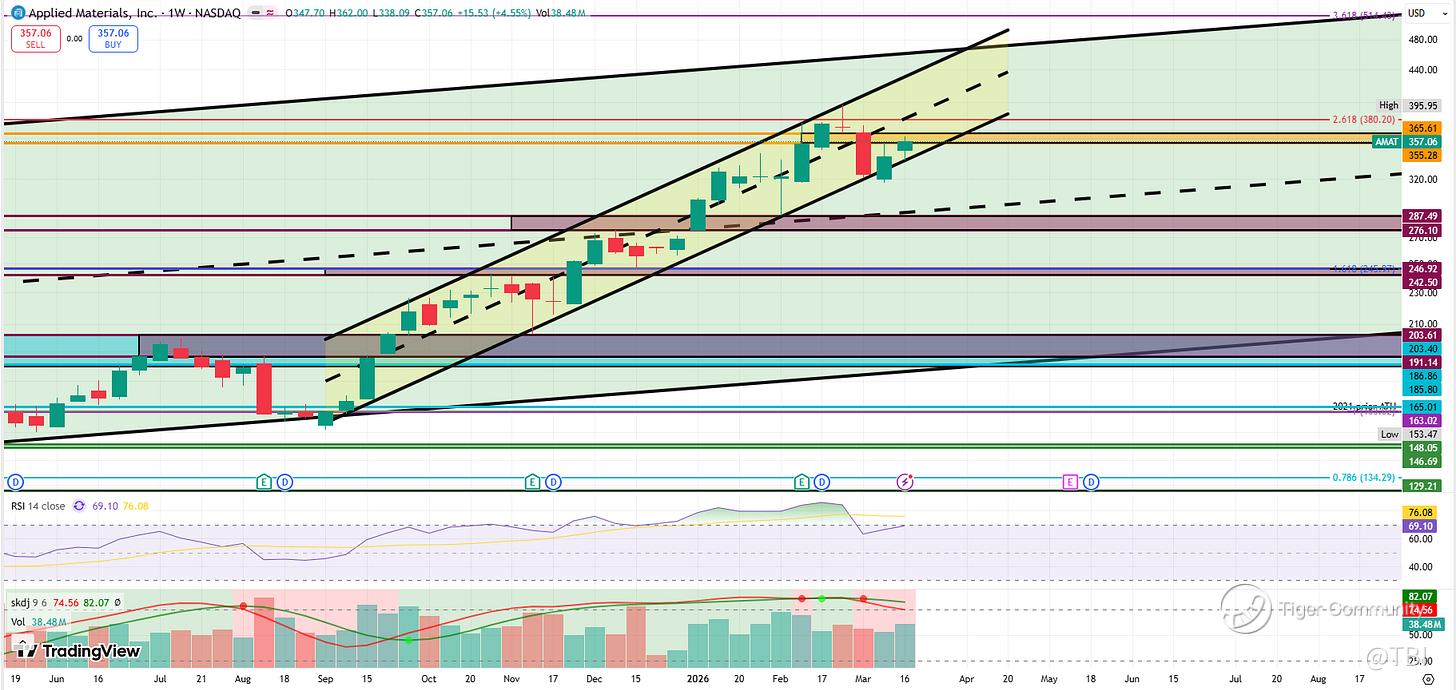 It rejected off the 2.618 Fib extension at 380.20 and has since formed a weekly imbalance at 355-366. After the retest of yellow channel support, AMAT is currently in the midst of retesting the said imbalance from below.