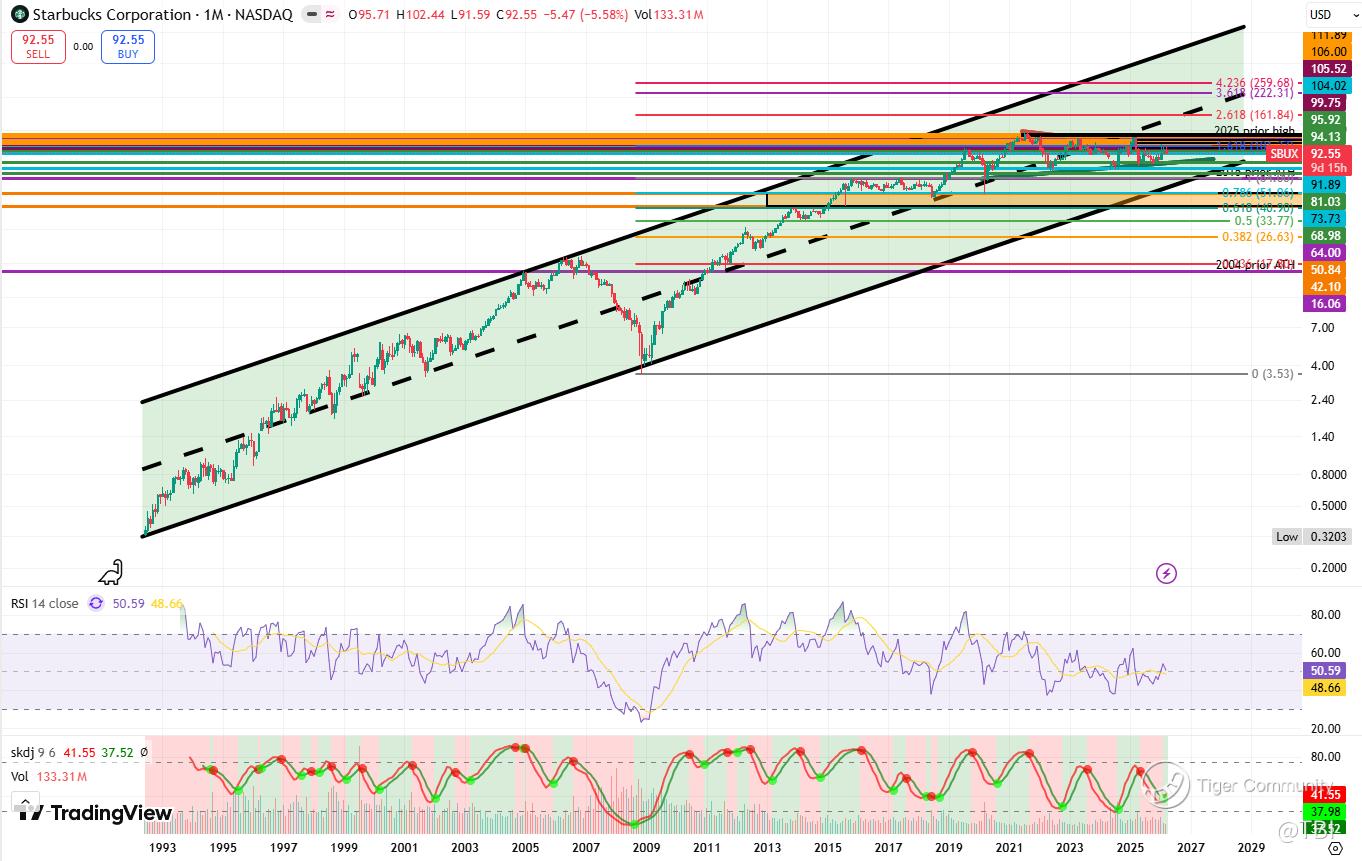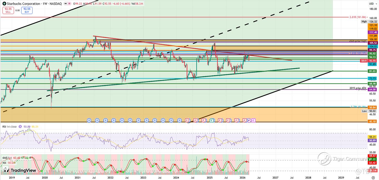 Otherwise, if SBUX breaks above the 101.37 Fib level and turns it into support, it's more likely to see another push back into the 2025 prior high at 117.40.