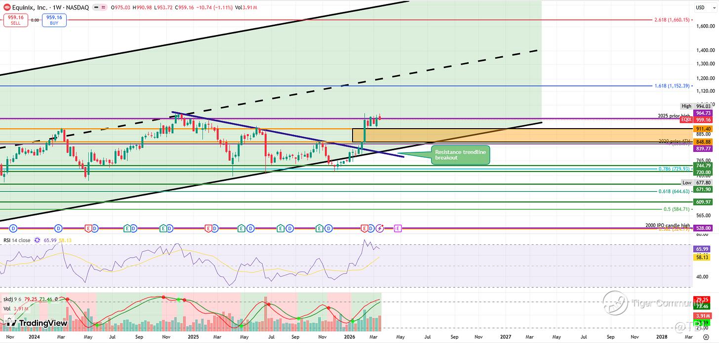 However, if EQIX continues to reject the 964.73 prior high, then it could retrace into the 911.40 weekly level.