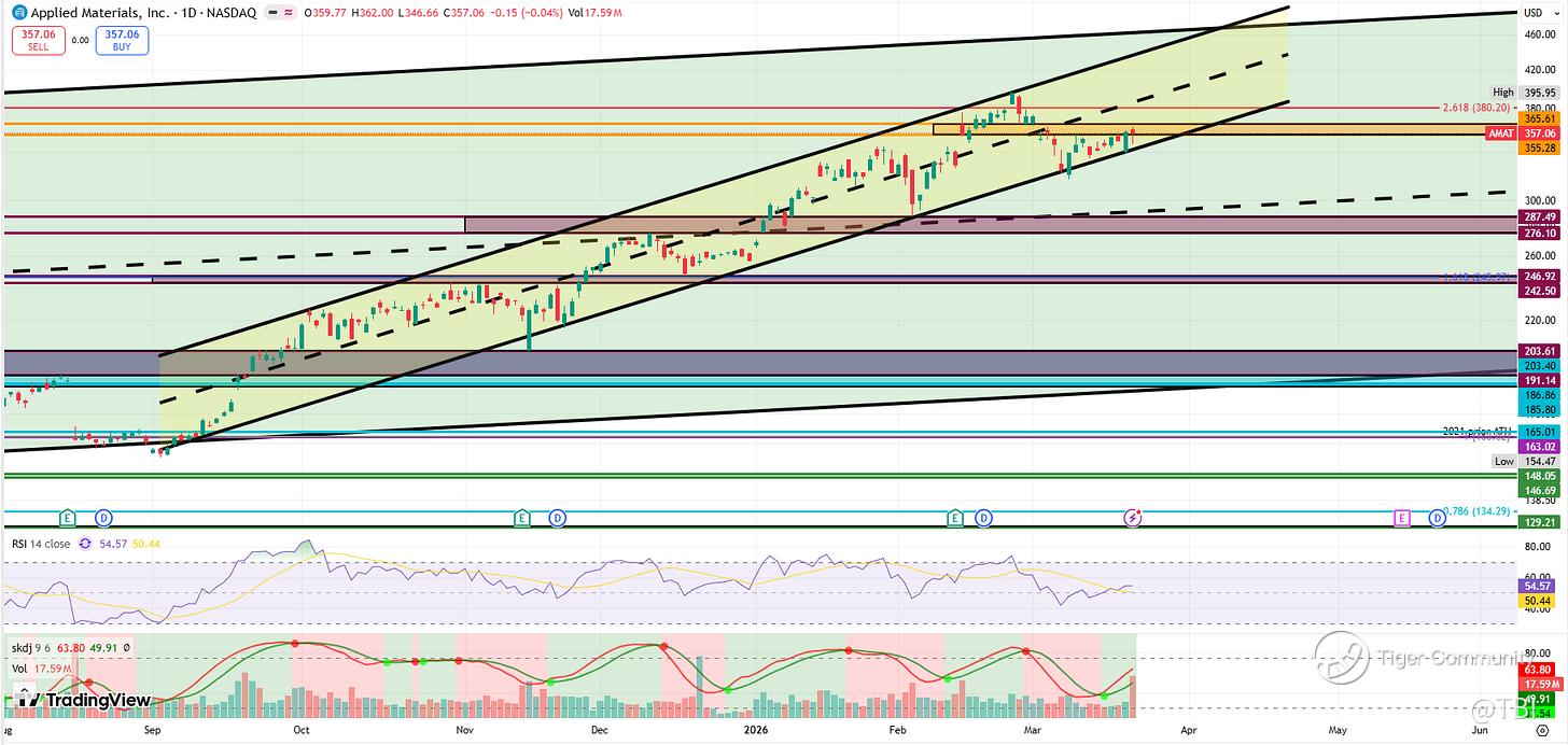 Otherwise, if AMAT fills the 355-366 and turns it into support, it can push back into the 380.20 Fib level. Note that if AMAT turns this Fib level into support, it could see upside continuation into the green channel resistance.