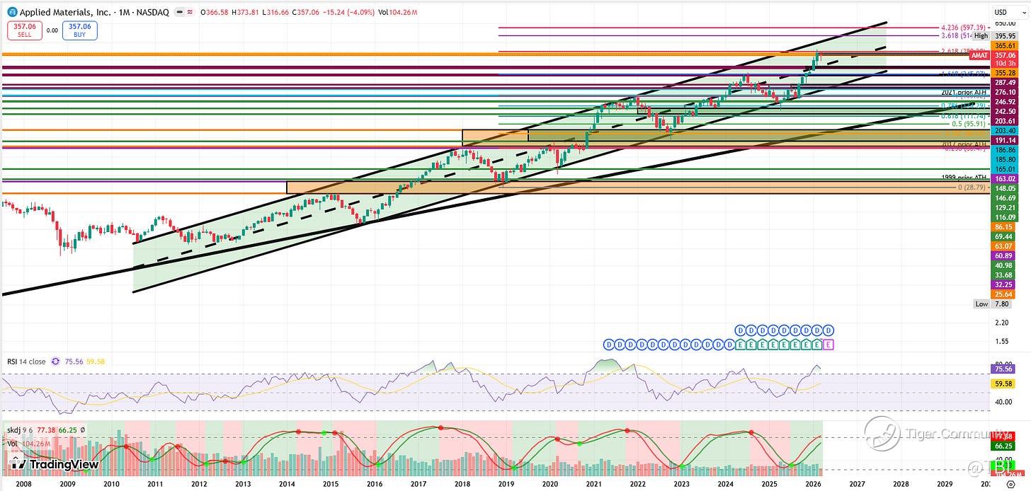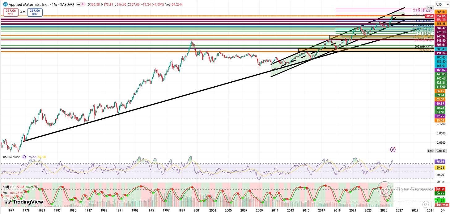 If AMAT rejects off this 355-366 weekly imbalance, a lower high and structural breakdown of the yellow channel could follow. This would likely result in a deeper pullback into the monthly imbalance at 276-287.