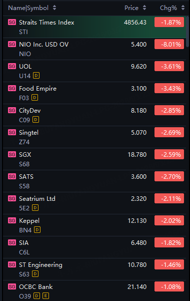 Singapore stocks opened lower on Monday. STI down 1.9%; Nio fell 8%; UOL fell 4%; Singtel, SGX fell 3%; SIA fell 2%; OCBC fell 1%.
