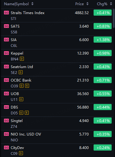 Singapore stocks opened higher on Wednesday. STI up 0.4%; SIA, OCBC up 1%.