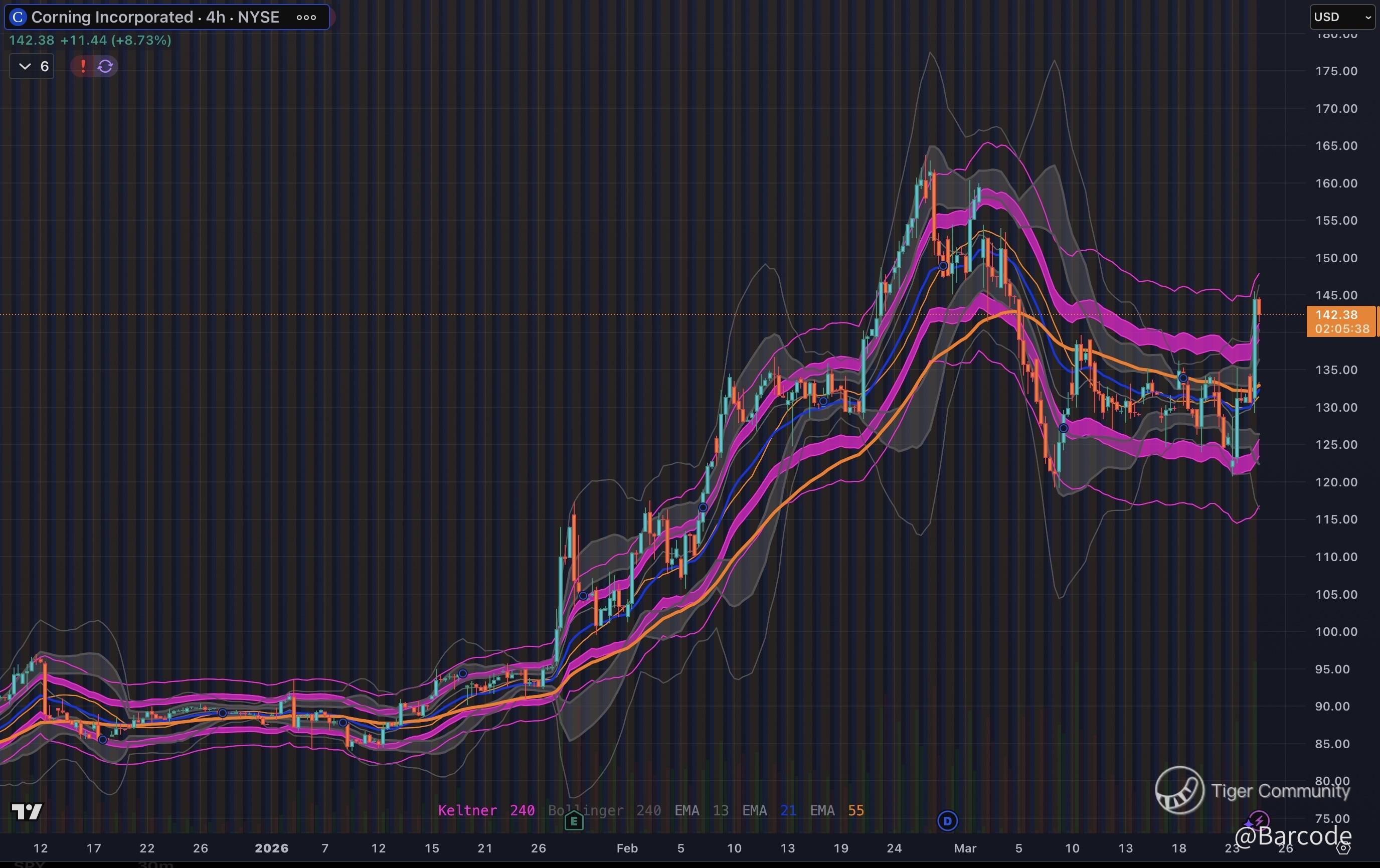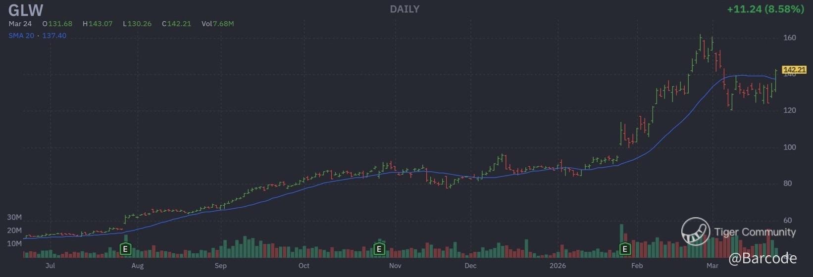 Price action remains structurally constructive. $GLW is holding within range of its 25Feb26 all-time high at $162.06, following a +180% year-over-year advance that signals sustained institutional sponsorship rather than speculative momentum.