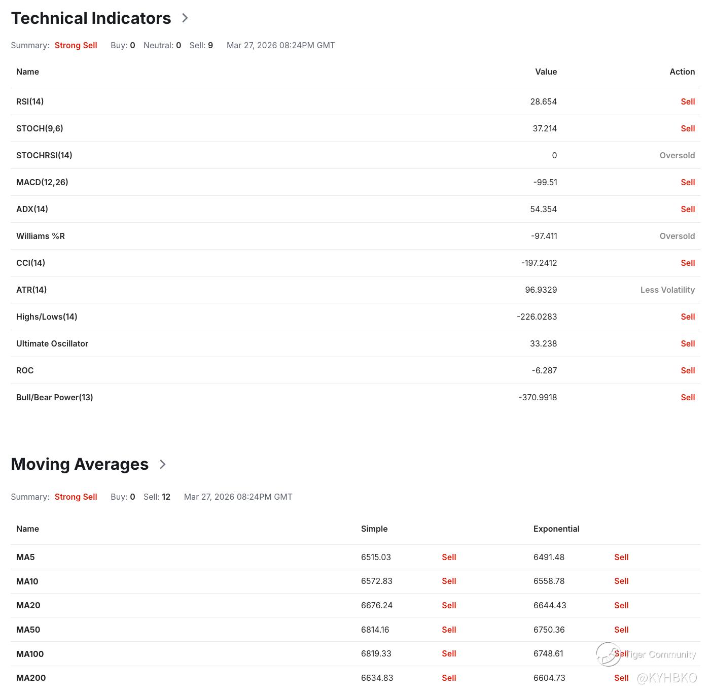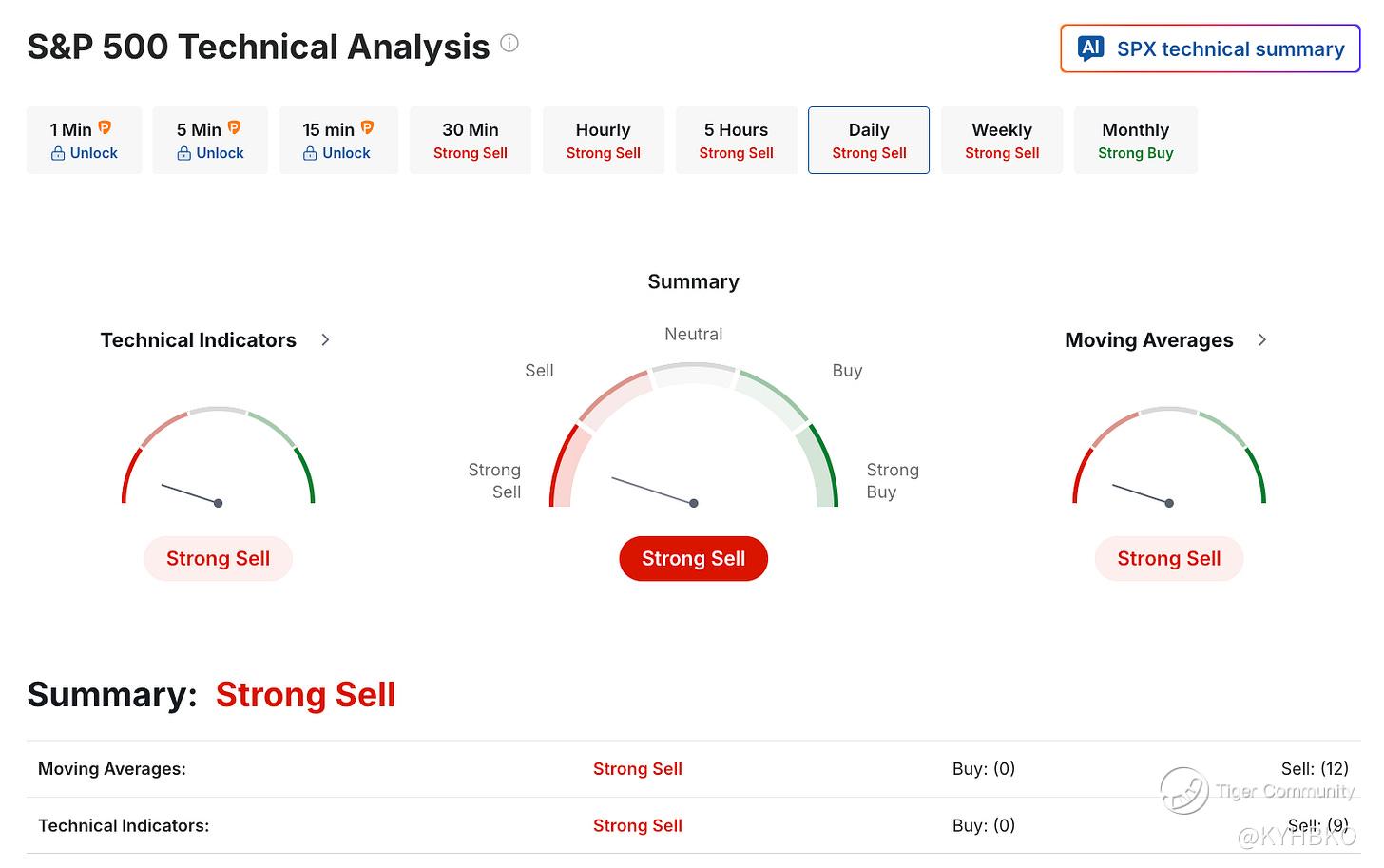 Based on an analysis of 21 technical indicators, the S&P 500 currently receives a “Strong Sell” rating on the daily interval. For the second consecutive week, all technical indicators signal a “Sell” recommendation, with none indicating a “Buy.” Even across shorter time frames, such as the 5-, 10-, and 20-period moving averages, each supports a “Sell” rating.
