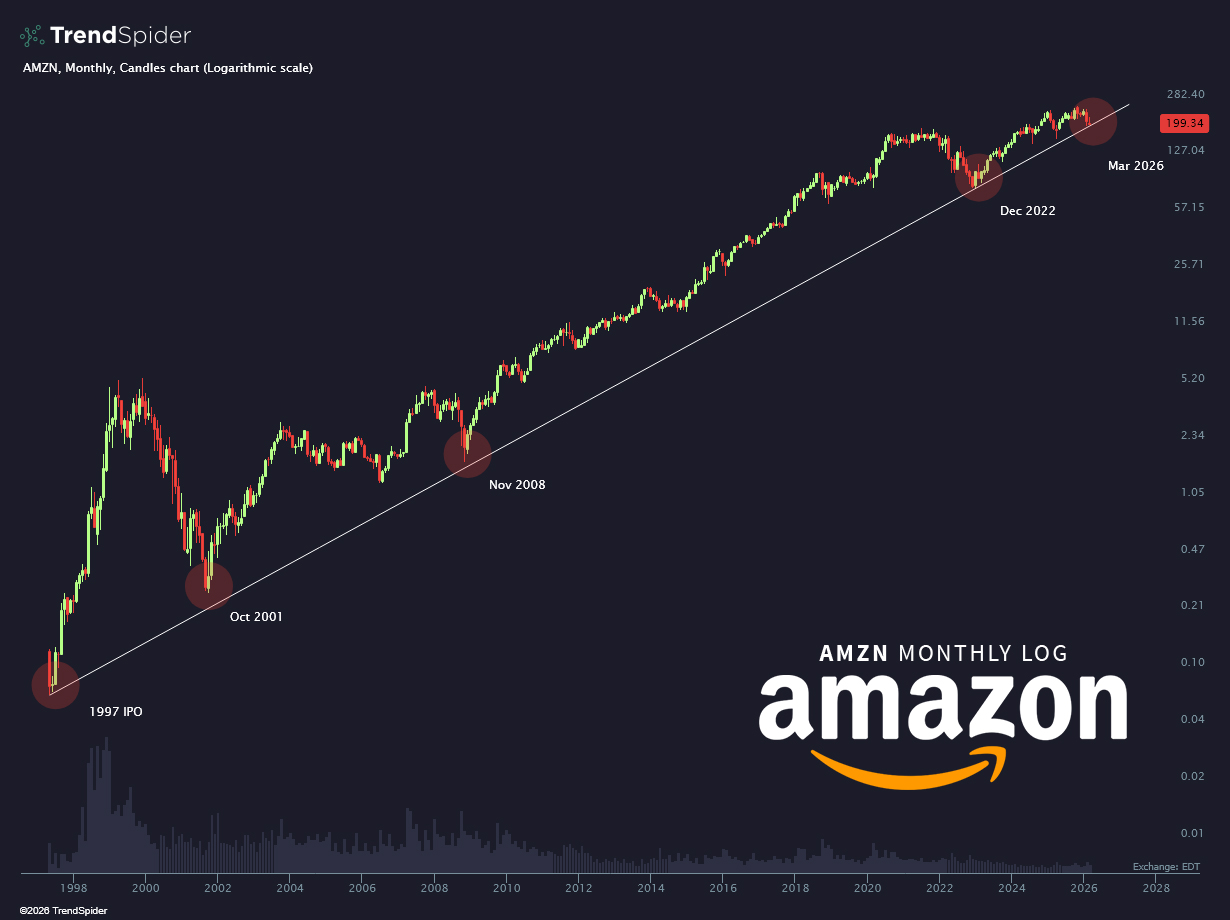 The most important trendline in $Amazon.com(AMZN)$'s history is being tested again.