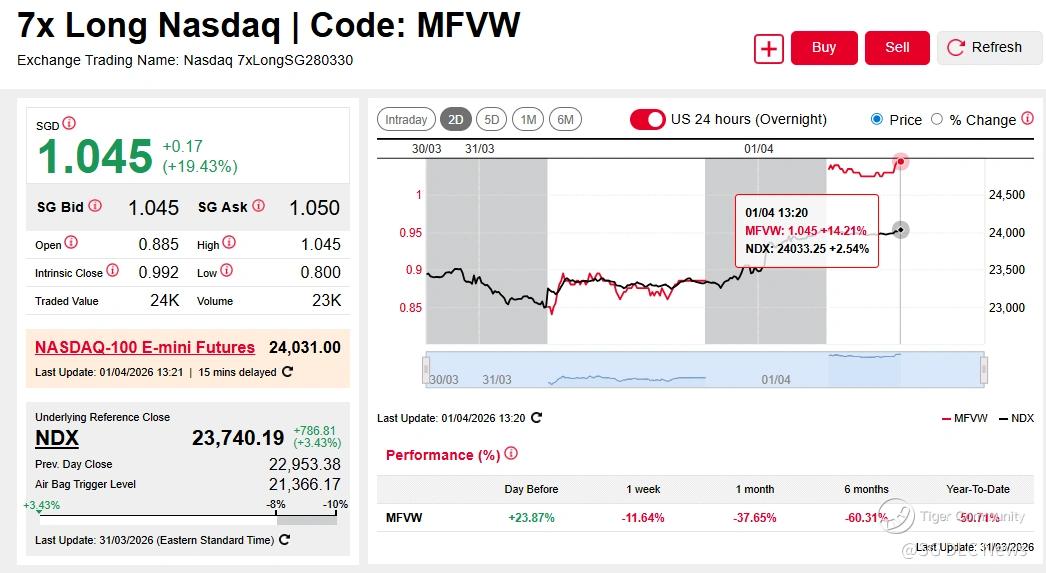 Asian Markets were tracking the strong US performance overnight, as the Nasdaq-100 surged 3,4%. Amplifying the return, theNasdaq 7x Long DLC (MFVW) rose about 24%, with the Nasdaq 7x Short DLC (FFIW) sinking around the same magnitude.