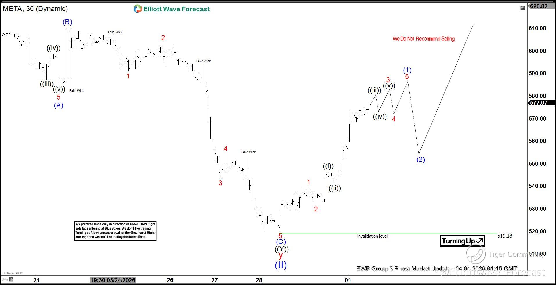 After forming a significant top on August 15, 2025, at $796.25, META entered a multi‑month corrective phase. This decline unfolded as a double three Elliott Wave structure, reflecting a complex corrective pattern. From the August peak, wave w concluded at $580.32, followed by wave x at $744. The subsequent wave y subdivided into a zigzag formation. Within this sequence, wave ((W)) ended at $628.14, wave ((X)) at $672.75, and wave ((Y)) at $519.18, as illustrated in the thirty‑minute chart. This completed wave (II) at a higher degree, establishing a critical low.