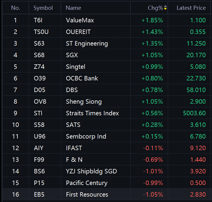Singapore stocks opened higher on Thursday. STI rose 0.56%; ValueMax up 1.85%; OUEREIT, ST Engineering, SGX, Singtel up around 1%; OCBC Bank, DBS up nearly 1%.