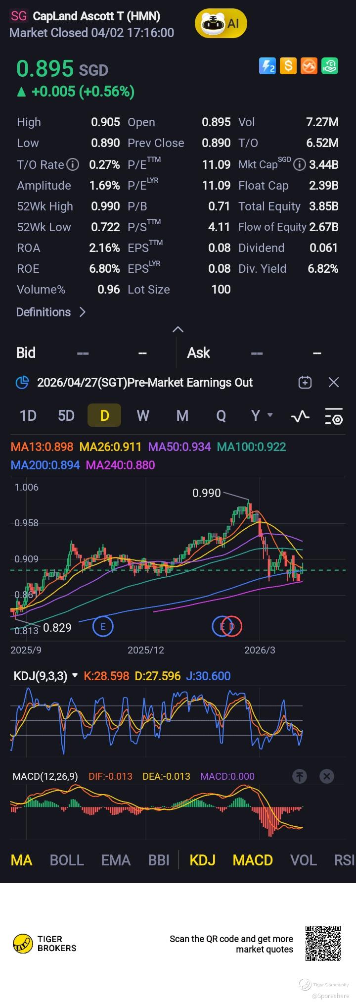 SI) All the gains returning back! She is back to 89.5 cents! Yield is about 6.81%. Annual dividend of 6.1 cents. Total Assets 8.9b. 103 properties in 16 countries! Solid! This year they sent 1 big booklet plus another letter, wasting so much paper and money on printing! AGM is on 23rd April 2PM at Sands Expo and Convention Centre. Likely snacks plus drinks provided!Do take note!