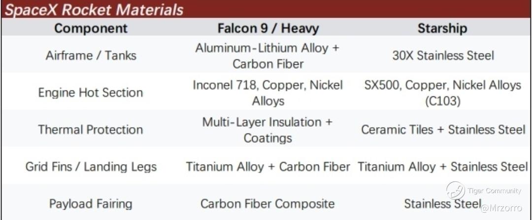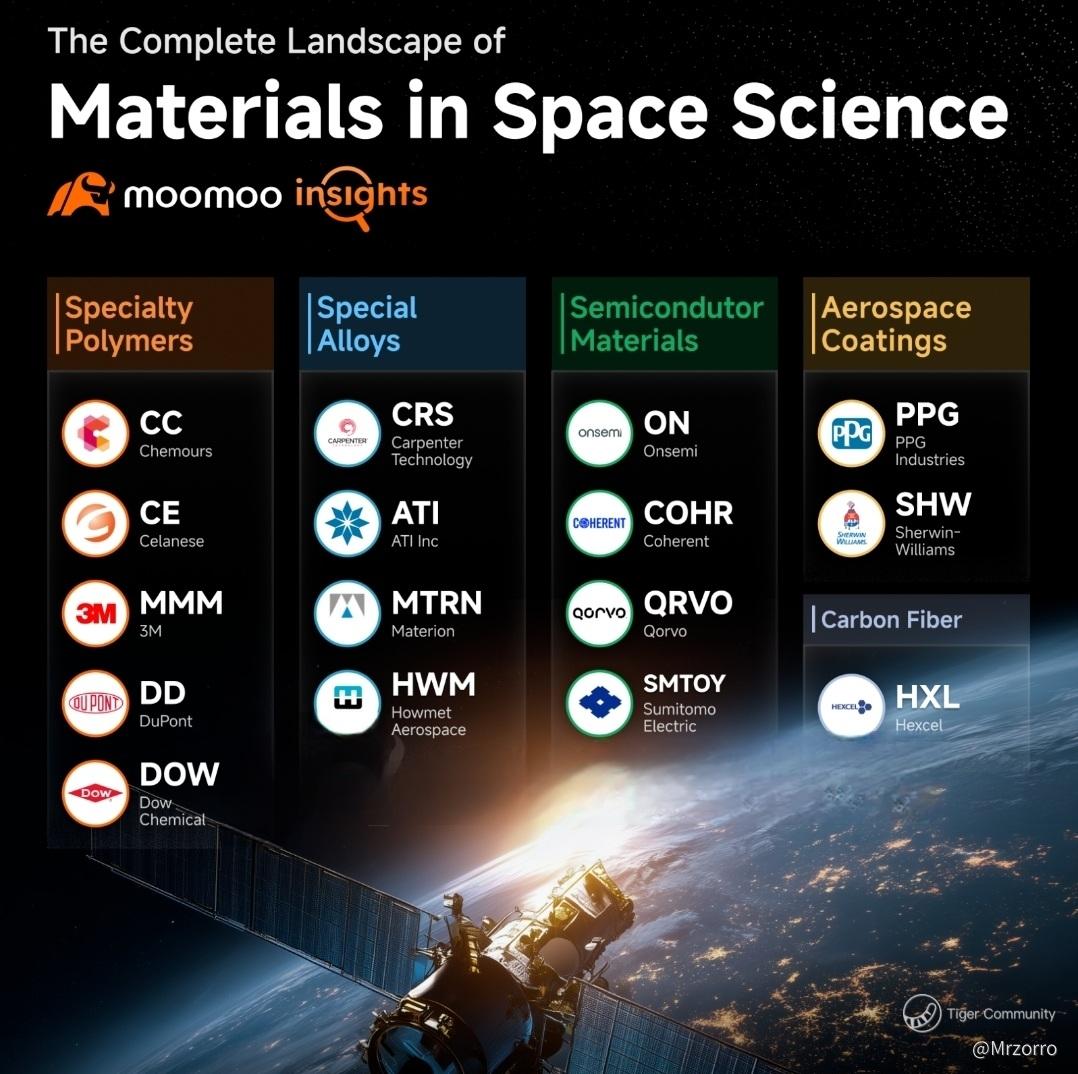 Taking SpaceX as an example, its essential materials include niobium metal, titanium alloys, and coatings. While Starship eliminated carbon fiber, it remains widely used in the space technology field.