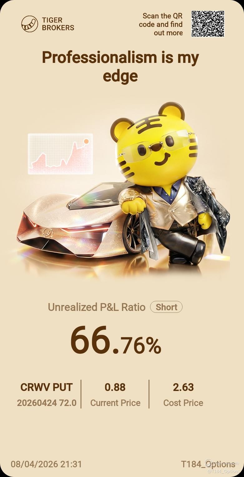 Sold $CRWV 20260424 $72.0 PUT at $2.63. Currently marked at $0.88 — unrealized gain of 66.76%.