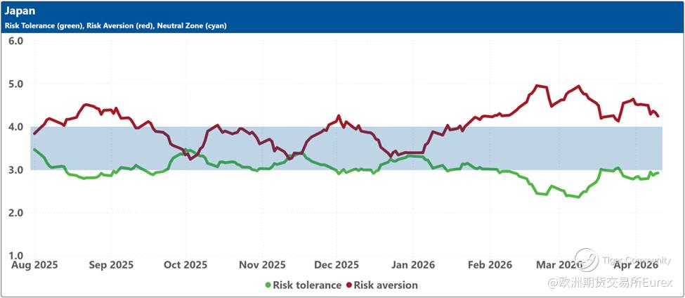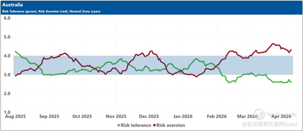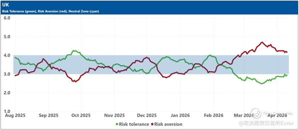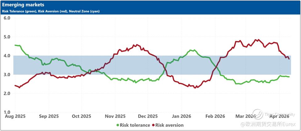 The blue shaded zone between levels 3 and 4 for both indicators signifies a reasonable balance between the supply and demand for risk in the market. When both lines remain within this blue zone, the market is considered ‘emotionally’ stable. However, when both lines move outside this zone, the significant imbalance in demand and supply for risk can lead to overreactions to unexpected news or risk events.
