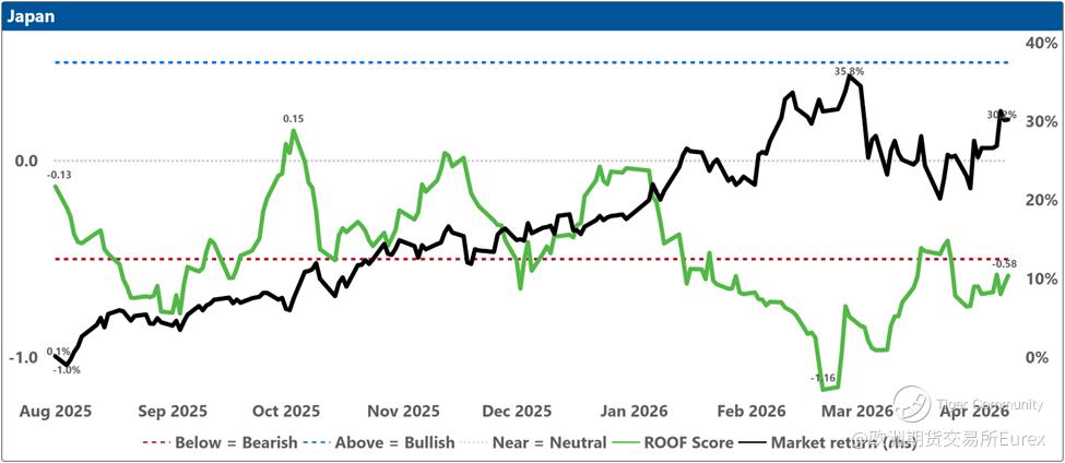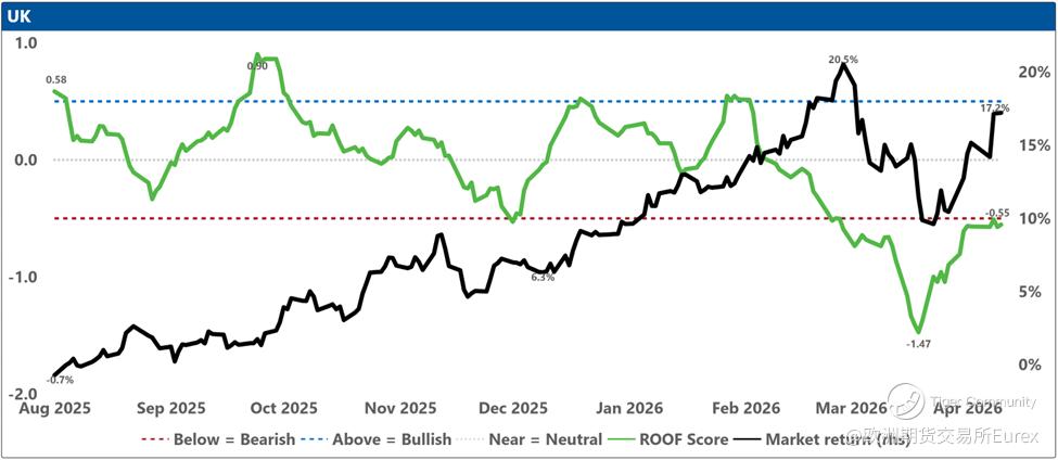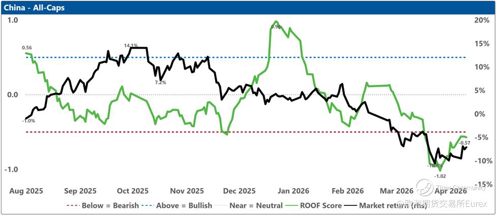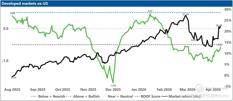 The top charts illustrate the ROOF ratio, which represents investor sentiment. This ratio is depicted in green on the left axis, while the cumulative returns of the underlying market are shown in black on the right axis. Key reference lines include:
