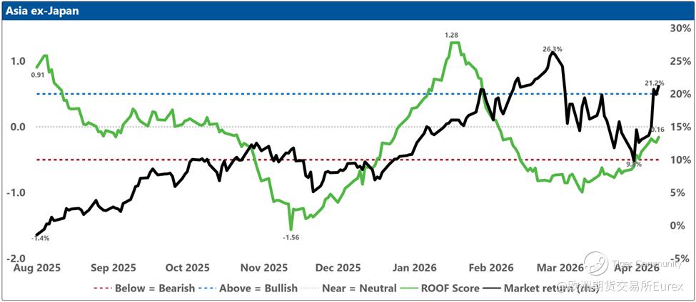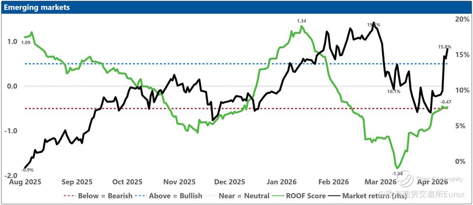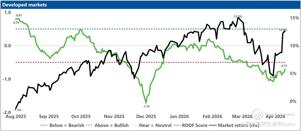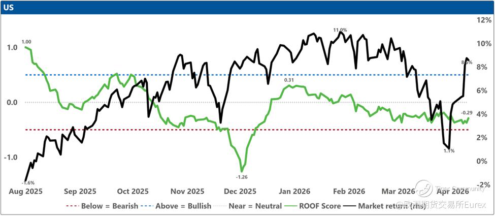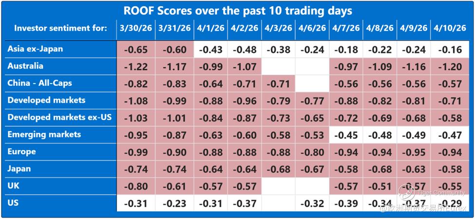 Now that the future the past had priced in has been denied by the present - no deal, no peace - investors have to rebalance for a different tomorrow: a doubly sealed Hormuz. In ROOF terms, last week’s “peace dividend” lifted risk tolerance at the margin and took some pressure off risk aversion, but it never earned the kind of broad, confident buy-in we saw after the pause in Liberation Day tariffs in April 2025. Sentiment stopped getting worse and even recovered slightly, yet it remained bearish in eight of ten markets: a rally led by the most risk-tolerant speculators and contrarians, while everyone else stayed defensive in a trust-but-verify posture. With diplomacy now dead, that marginal bid is likely to fade. Risk tolerance may not need to fall much further, and risk aversion may not need to rise much further, for the imbalance to reassert itself - more investors looking to shed risk than to add it. In that kind of market, tail risk has a habit of refusing to stay in the tail.
