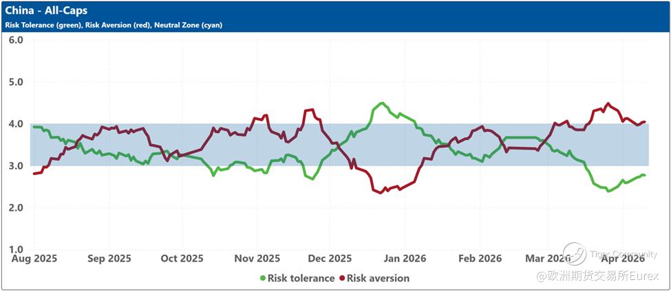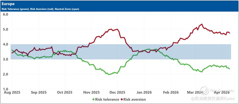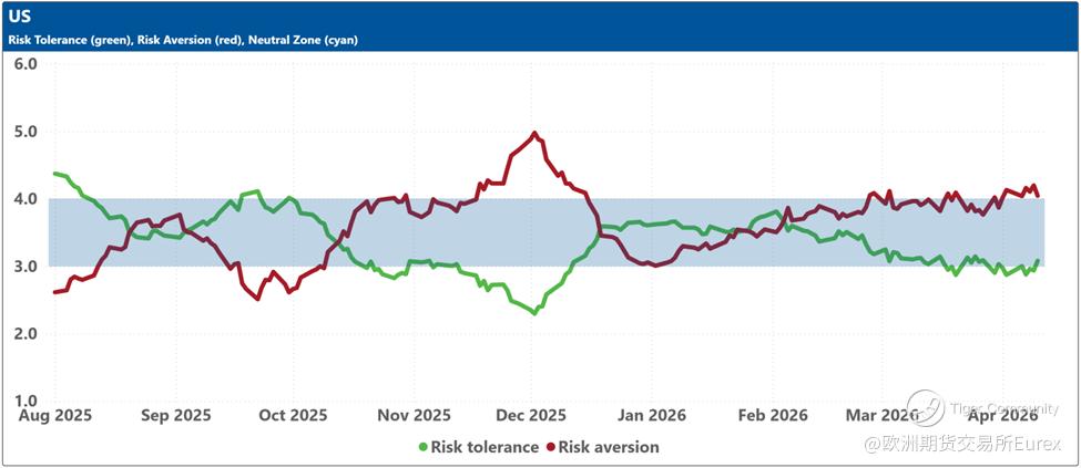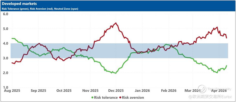 The bottom charts display the levels of risk tolerance (green line) and risk aversion (red line) within the market, representing investors' demand and supply for risk, respectively. Key insights include:
