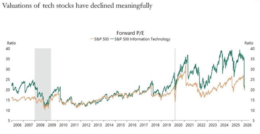 U.S. tech valuations have compressed from 40x to 20x forward earnings in just weeks and now sit below where they were when ChatGPT launched.