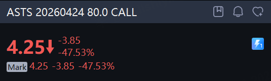 There are 333.60K AST SpaceMobile option contracts traded on Monday, up 73% from the previous trading day. Call options account for 68% of overall option trades. Particularly high volume was seen for the $80 strike call option expiring April 24, with 15,599 contracts trading. ASTS 20260424 80.0 CALL