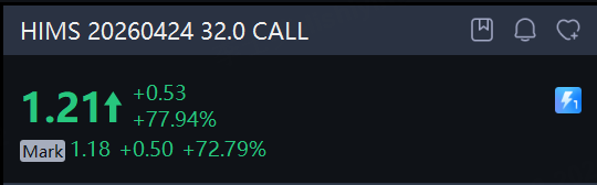 There are 419.85K Hims & Hers option contracts traded on Monday, down 11% from the previous trading day. Call options account for 77% of overall option trades. Particularly high volume was seen for the $32 strike call option expiring April 24, with 19,847 contracts trading. HIMS 20260424 32.0 CALL