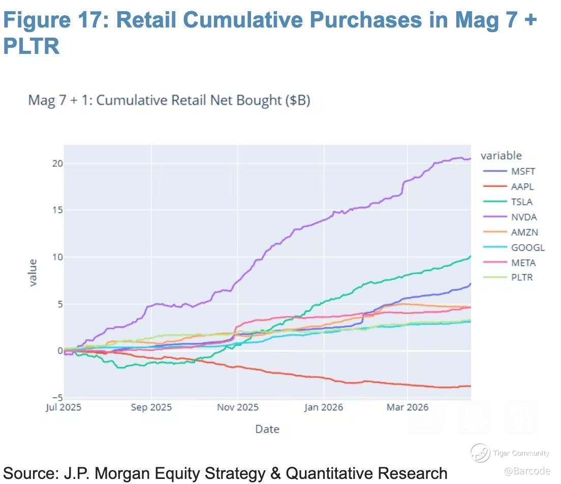 π J.P. Morgan flow data through March 2026 confirms persistent retail accumulation across the Magnificent 7, extending even into names like $PLTR. Cumulative flows highlight the scale of conviction: